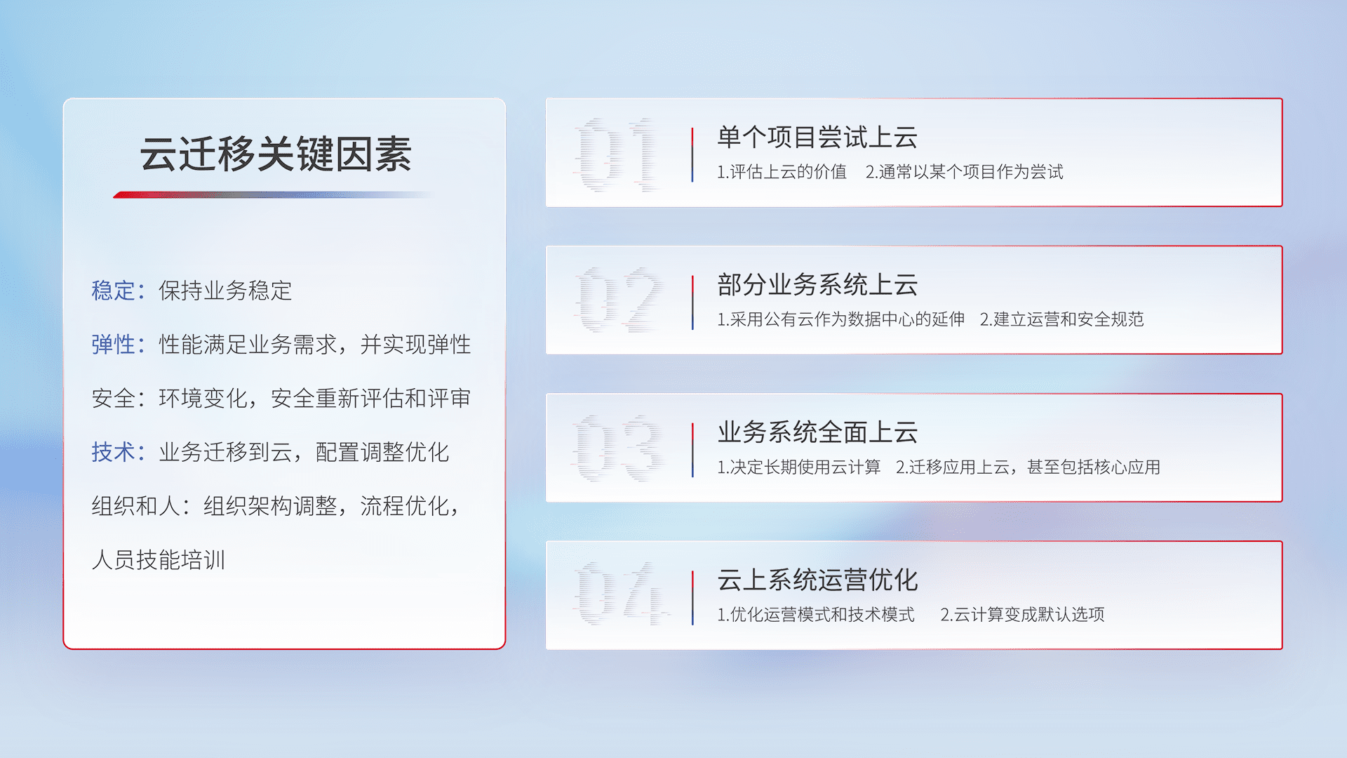 结合实际业务,,,,从规划设计、、、云平台选型、、、、云原生改造、、数据迁移、、、、集成交付,,,,迁移全过程为客户识别最佳上云路径,,,做好风险识别管理,,,,设计网络架构、、、身份权限、、、安全审计合规、、操作审计、、、、日志审计、、监控告警策略、、、、多站点容灾设计等,,,对云上基础设施进行整体规划,,,,提升IT治理水平,,以满足弹性、、、高可用、、、、高性能的需求。。