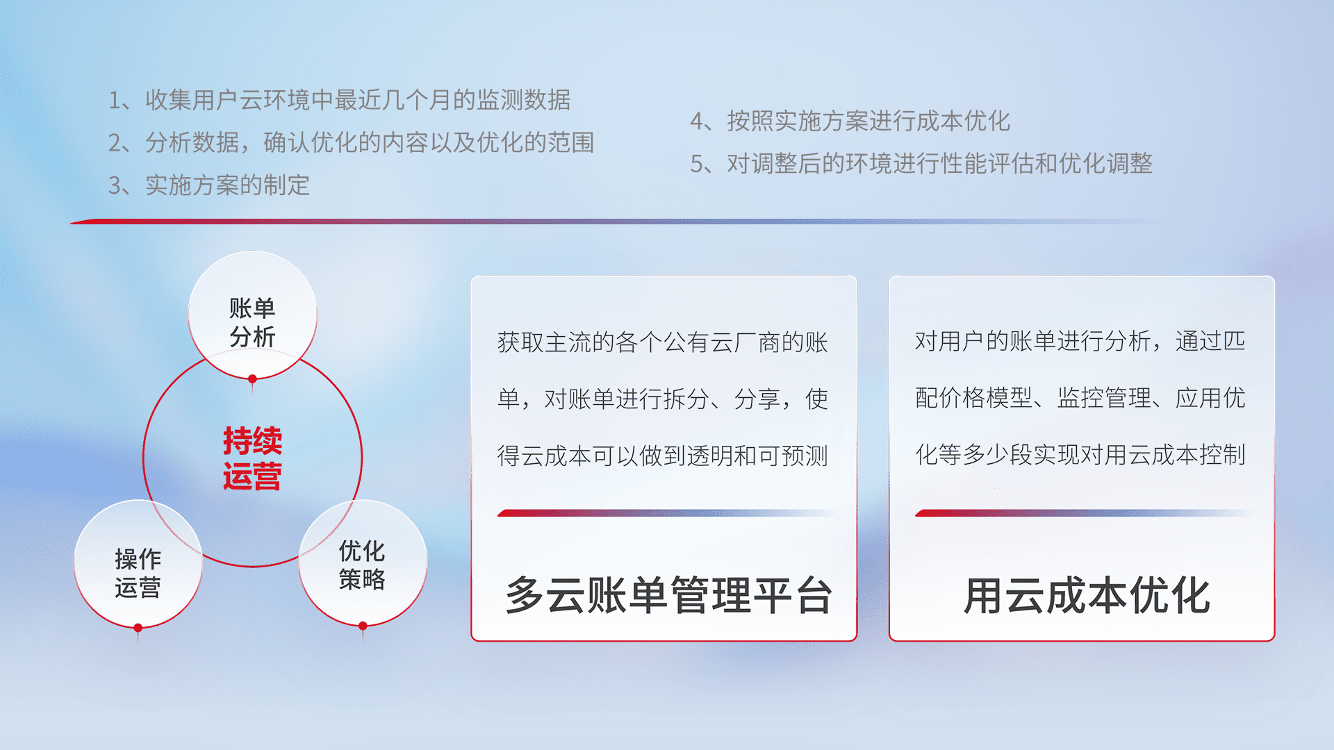 通过多云纳管,,以统一的资源数据模型把客户的云资源进行抽象和封装,,,进而实现对多云资源的统一操作,,保障云资源管理的可靠性、、、稳定性与可用性。。。量身定制化运维内容,,,,配置、、开发运维、、、、补丁管理、、、备份、、监控、、、、认证和访问管理、、审计和日常巡检等,,保障在用云过程中的可靠度,,,,稳定度以及高可用率。。